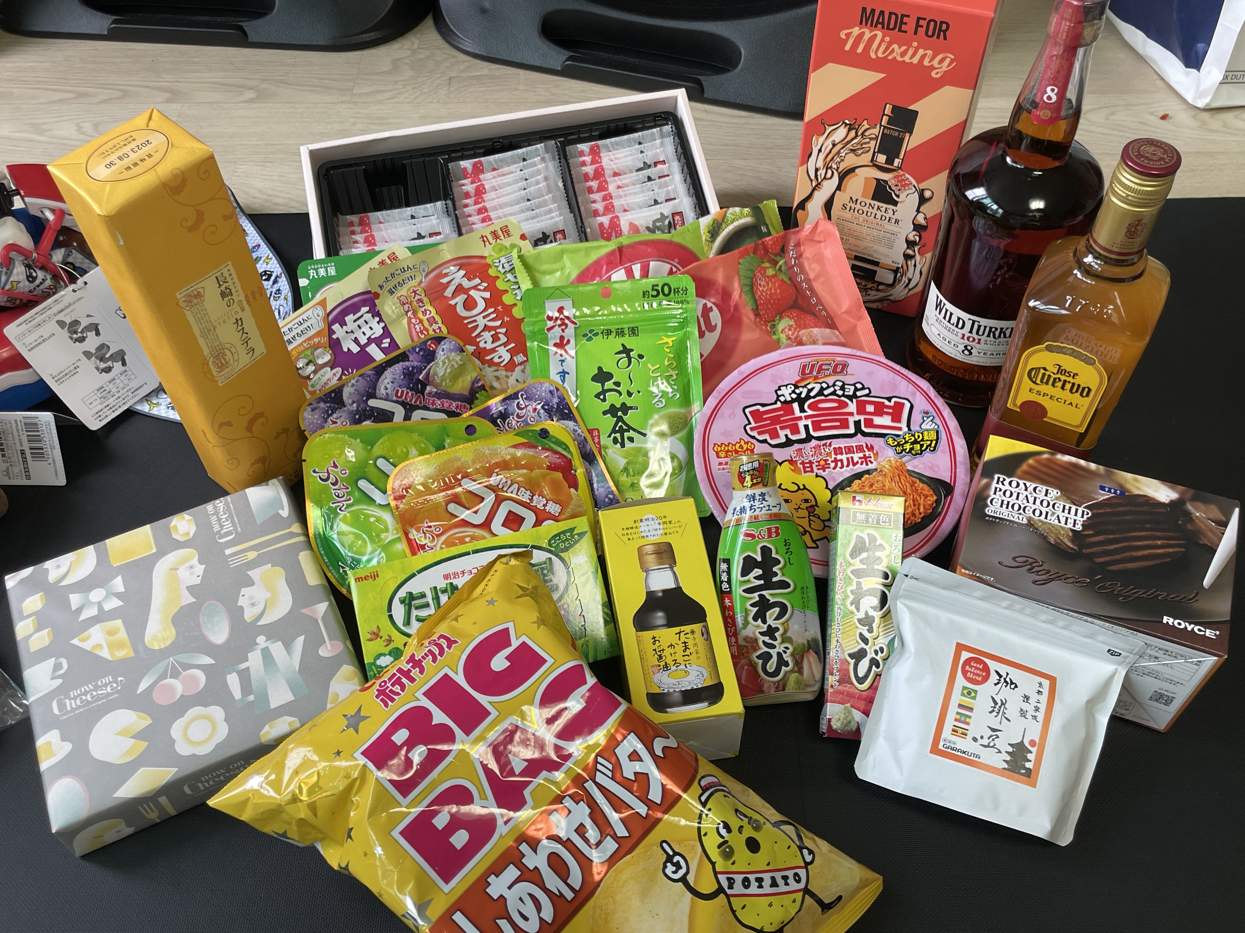 마지막으로 돈키호테. 코로로 곤약젤리 4종, 녹차가루, 계란간장, 감자칩, 킷캣 녹차/딸기, 와일드터키101, 호세꾸엘보 그리고 궁금해서사본 UFO사의 볶음면 컵라면 ㅋㅋㅋ