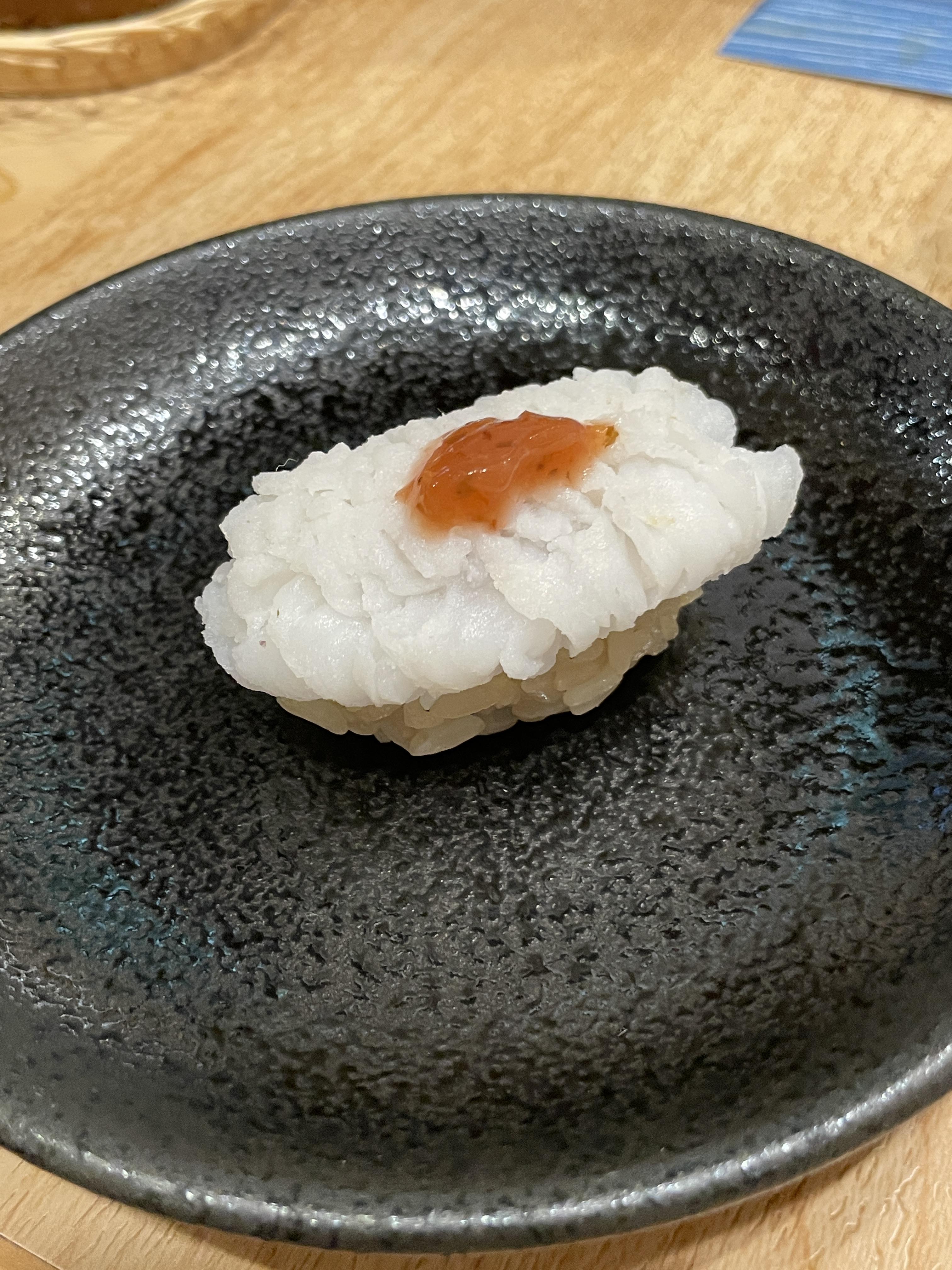 한치회와 우니, 연어알. 왼쪽에 놓여진 대나무종이? 같은걸로 우니를 퍼먹으면 된다. 우니와 한치와 연어의 조합이 아주 나이스. 아쉽게도 탑급으로 맛있진 않았다. 하지만 뭔가 저 빳빳한 대나무종이로 우니를 퍼먹는게 재밌어....!