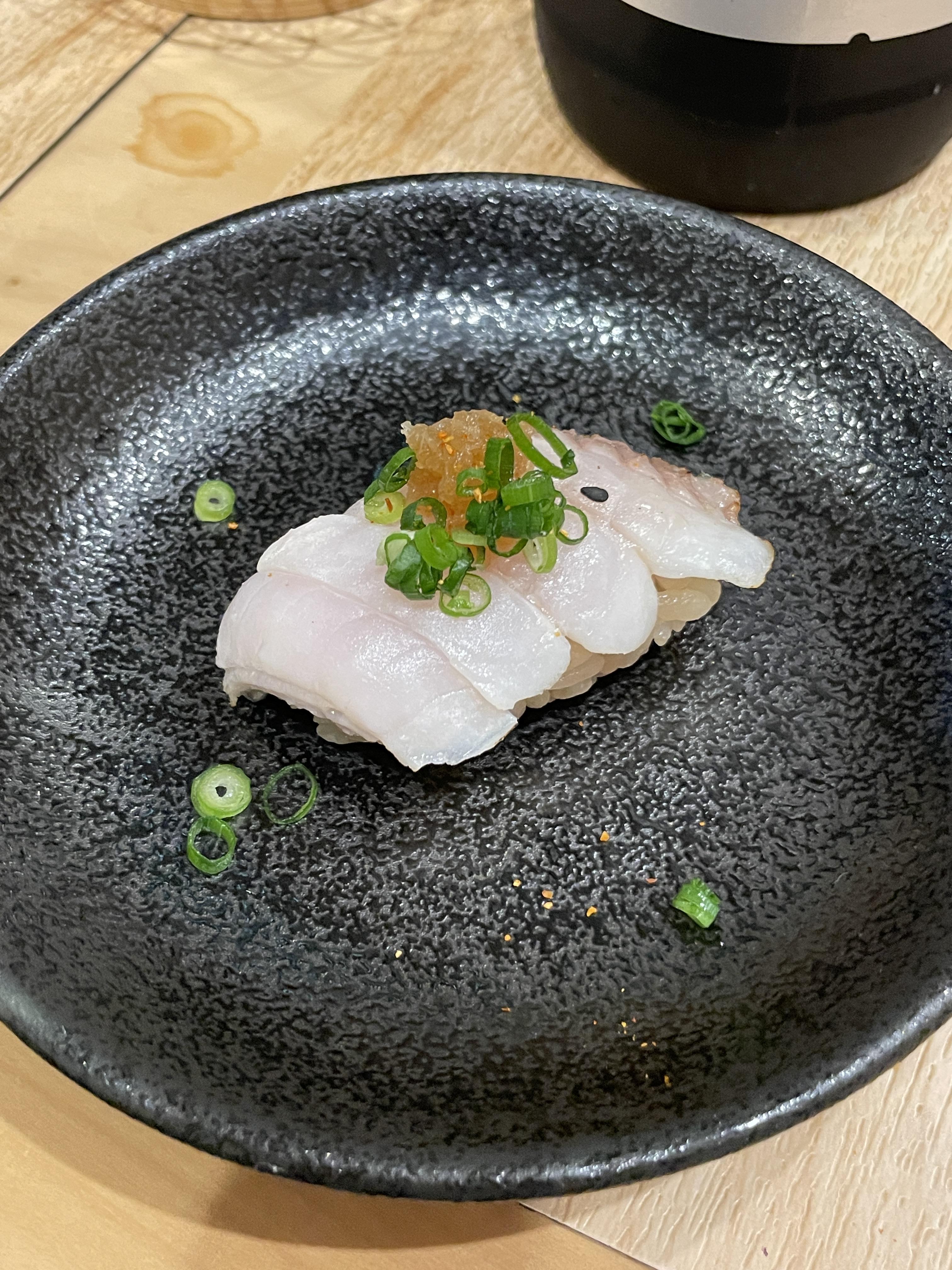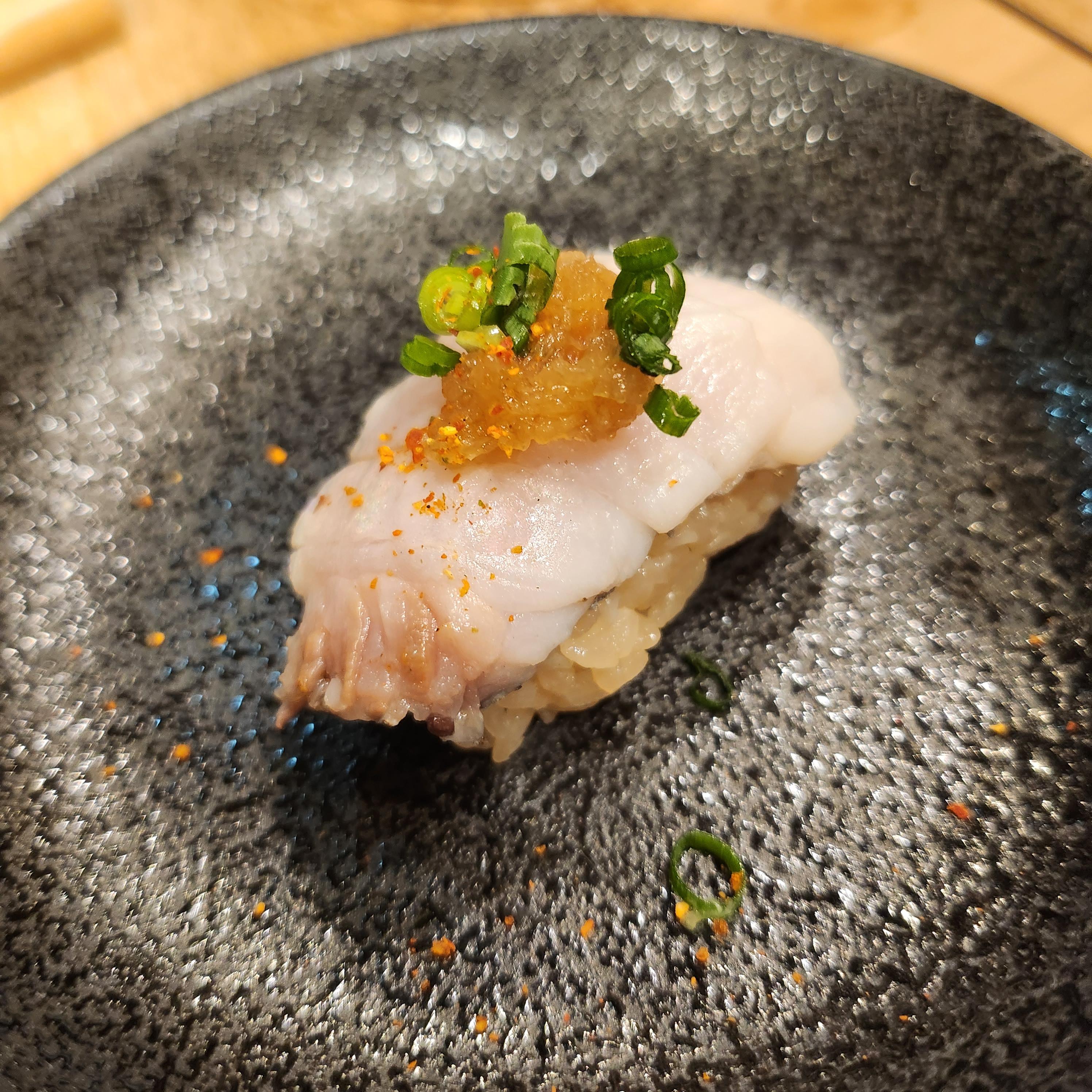 다시 시작된 코스. 아래 두장의 사진은 같은 초밥인데 비주얼이 좀 다르다 ㅋㅋㅋㅋㅋㅋ 갤럭시와 아이폰의 차이이기도 하고, 남친의 초밥이 조금더 익혀져서 나왔다는거. 근데 내 최애다 미친존맛탱; 잿방어?라는거 같은데 난 모르겠어.... 아무튼 이게 진짜 너어어어어어어무 맛있어서 마지막에 사진보여주며 이거 하나 더 주문했다는거 ㅋㅋㅋㅋㅋ