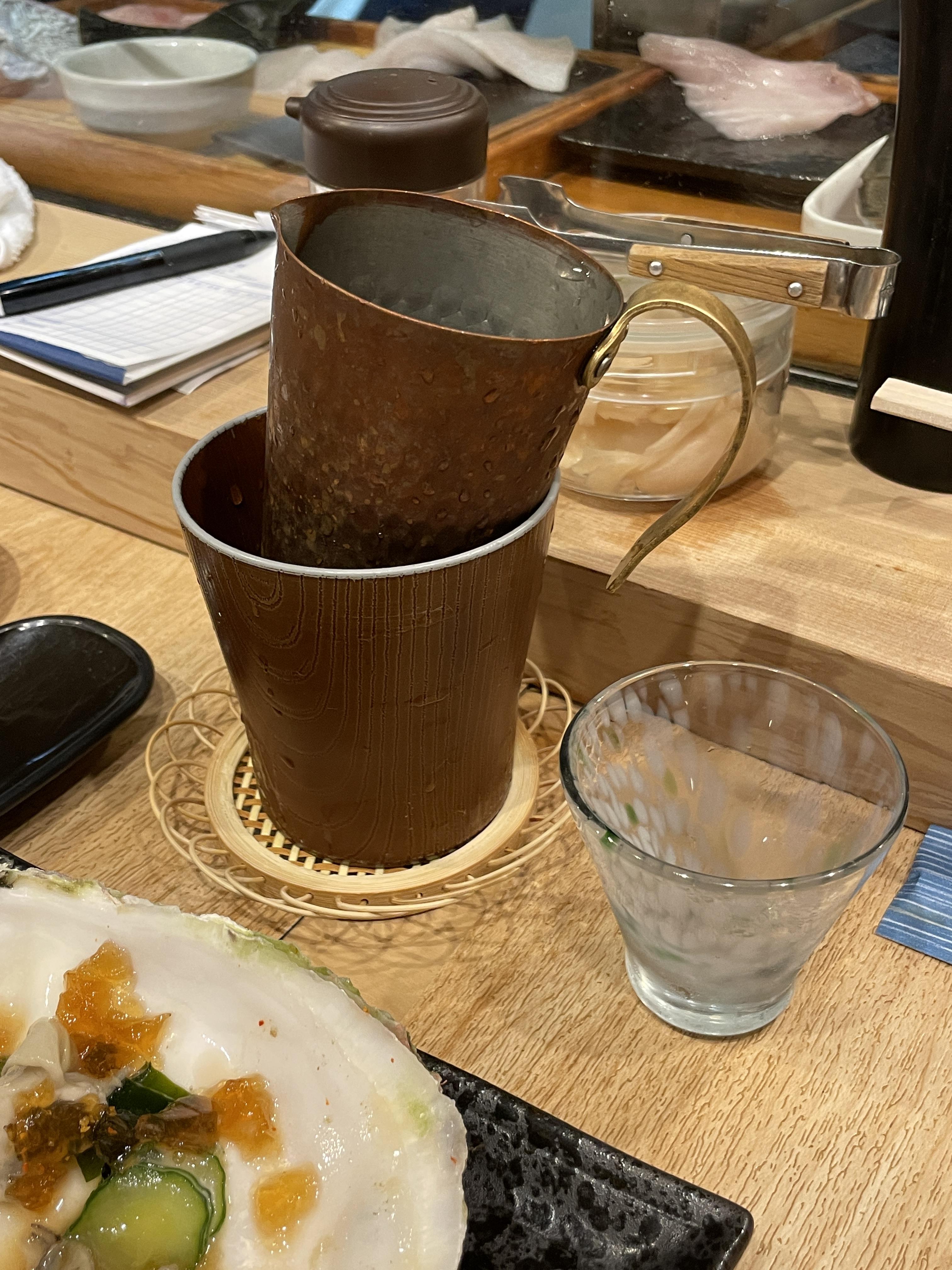 사케를 결정하면 저런 작은 동 칠링백에 사케가 담긴 동 주전자 담궈서 주신다. 이런 독특한 주전자마저 너무 새롭고 즐거운 경험 🤭