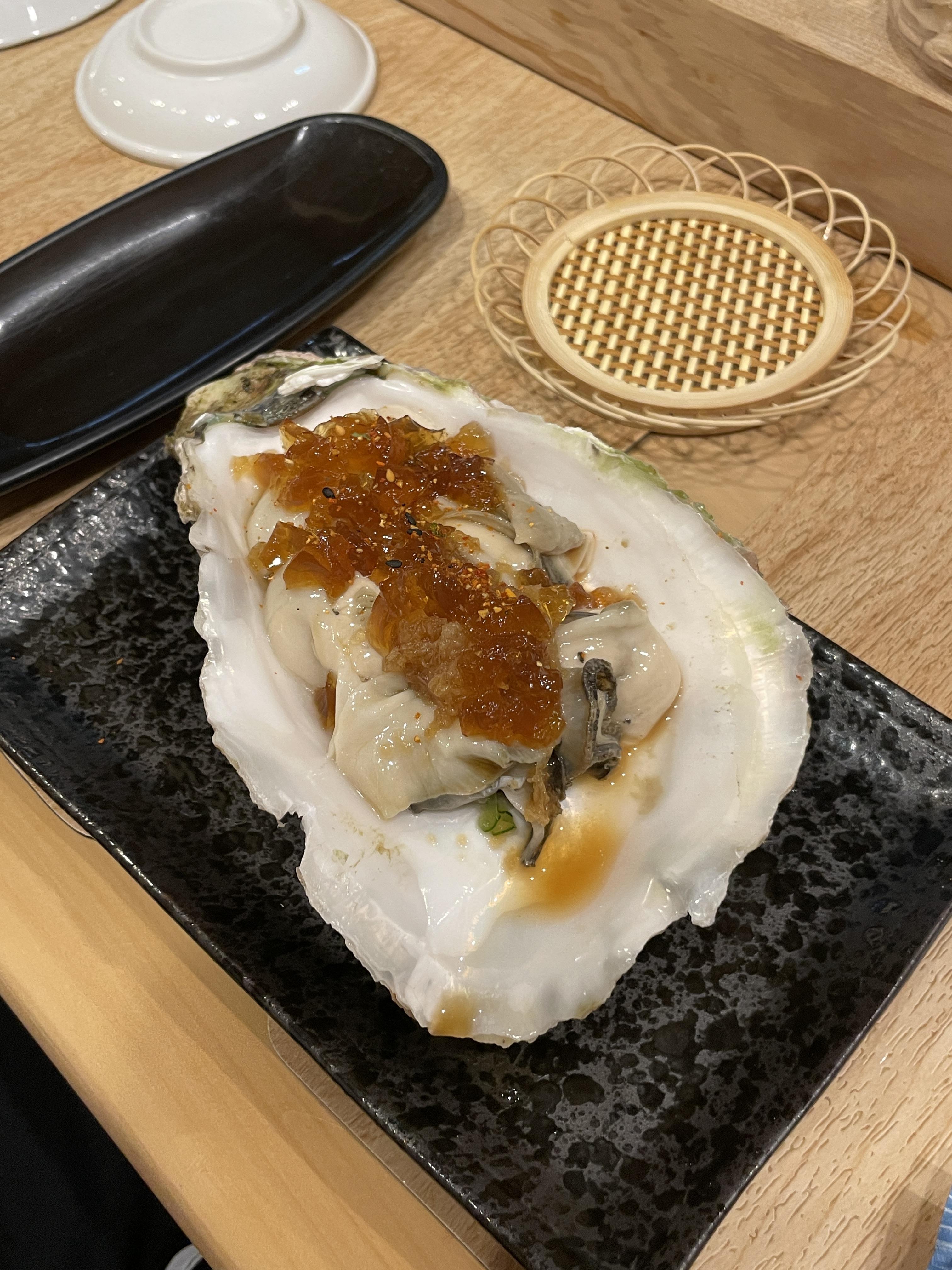 사케가 준비되기 전 먼저 나온 석화! 양이 꽤 되는데다 위에 간장에 절인듯한 달달한 유자가 올려져있다.
