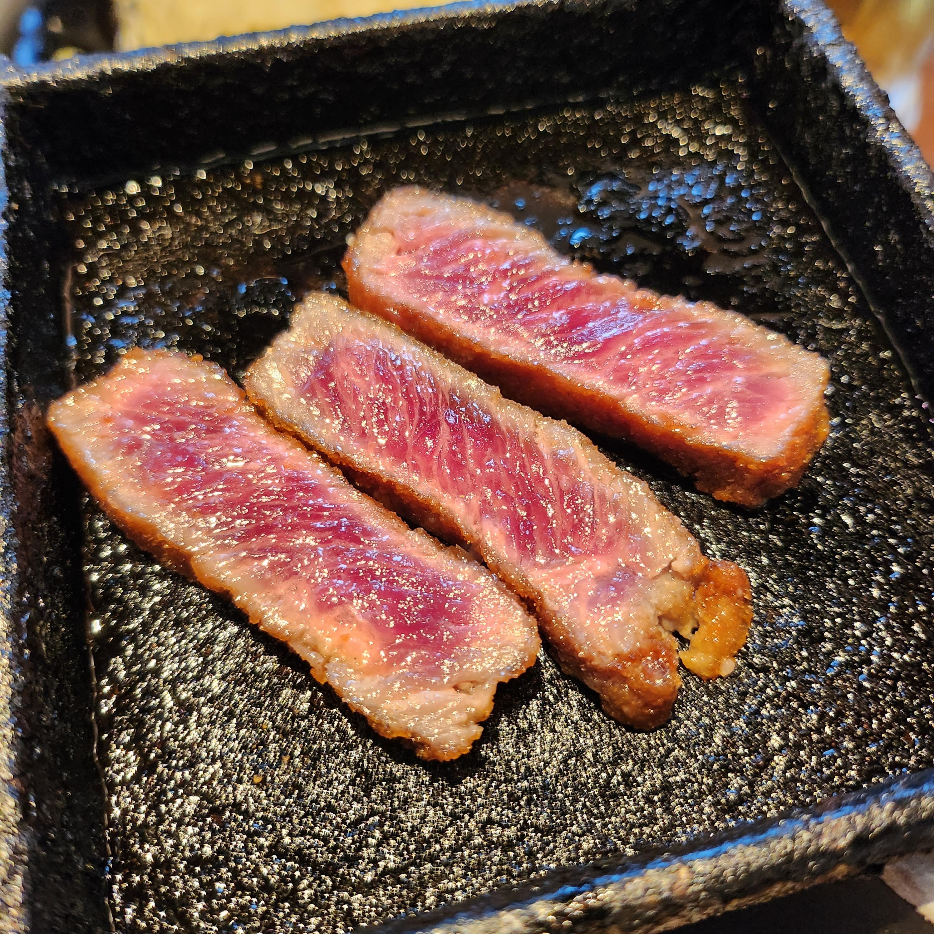촤~촤~ 다먹을때쯤 아래 불이 꺼진다. 나는 먹는게 꽤 느린편이라 두점정도 남았을때 불이 꺼졌는데, 날걸로 먹어도 맛있기때문에 한점은 잔열에 살짝 익혀먹고 한점은 그냥 먹었다는거 ㅋㅋㅋㅋㅋㅋ 직원에게 불꺼졌다 얘기하면 새로 고체연료를 넣어 불을 붙여준다.