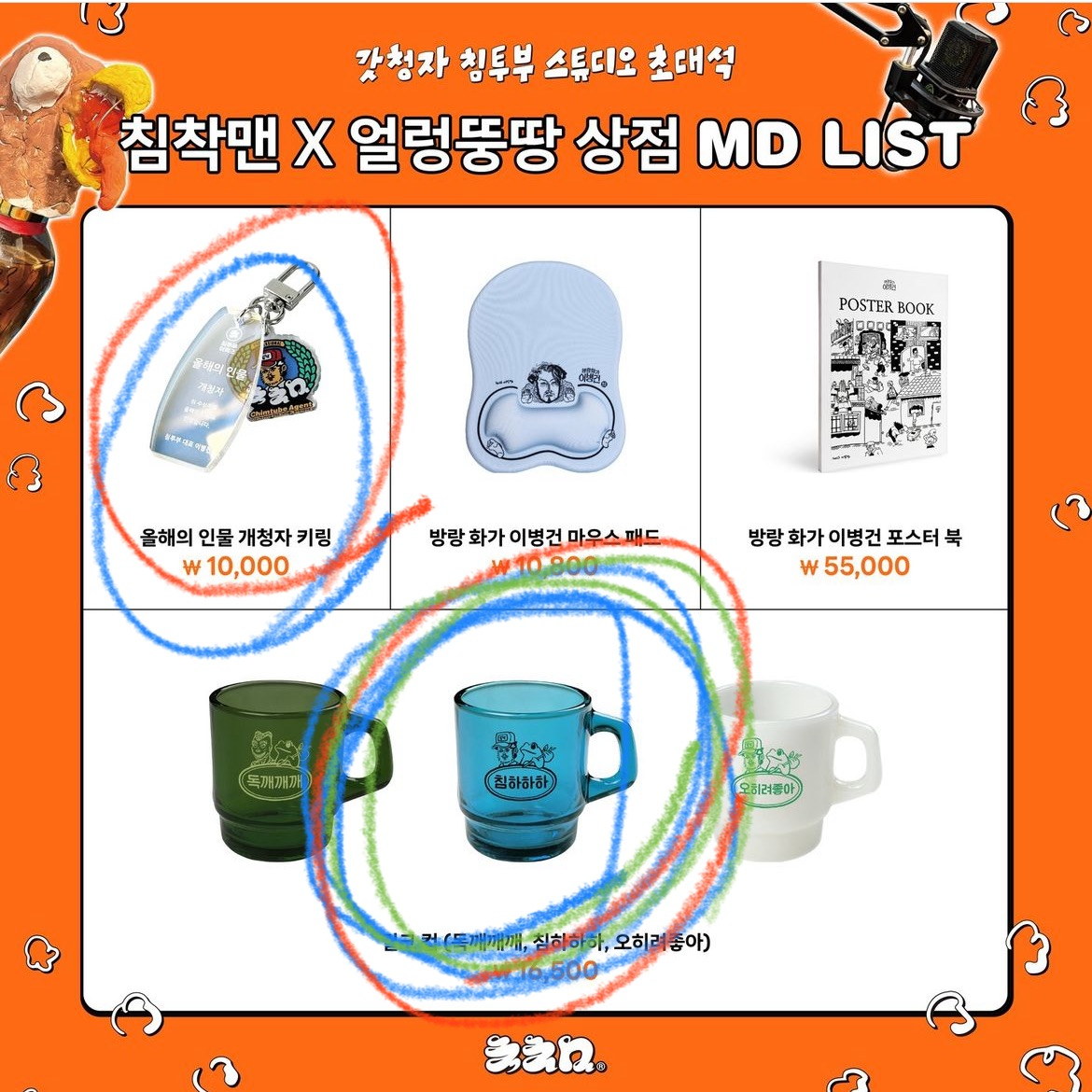 스티커 (1,800원) 8매, 누군가는 해야하잖아 키링/목만온 침공 (각 9,800원), 전문 시청팀 키링 (11,000원)